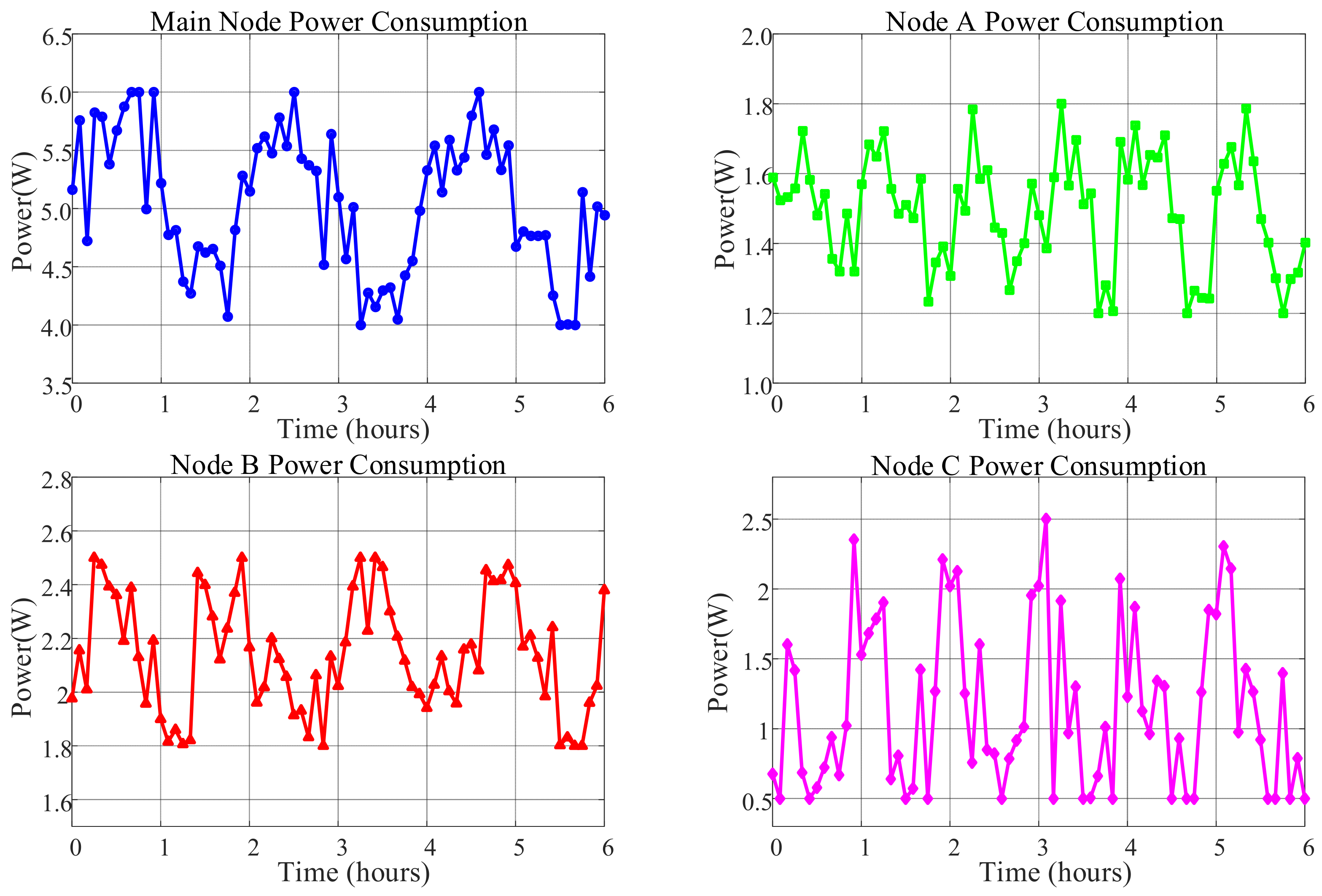 Figure 29 further reveals the operational characteristics of different nodes through their power consumption time series trends. The master node’s power curve remained relatively stable, fluctuating between 4.5 W and 5.5 W, consistent with the continuous operation of its core components including the Raspberry Pi 3B+, OpenMV camera, and Wi-Fi module. Nodes A and B showed regular periodic fluctuations around 1.5 W and 2.15 W, respectively, reflecting the operational pattern of the STM32 microcontroller, LoRa module, and various sensors performing data collection and transmission at fixed intervals. Notably, Node B exhibited greater power fluctuation than Node A due to its inclusion of multiple MQ-series gas sensors requiring preheating. Node C demonstrated the most distinctive power profile, maintaining low levels around 0.5–1 W for most of the time but showing significant peaks up to 2.5 W at specific moments, indicating high power consumption states when triggering audible-visual alarms or activating the water pump.