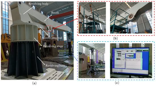 During the actual operation of concrete pump trucks, the loads acting on the pin shaft are primarily from the weight of the front-end structures [21]. To simulate the load performance under real operating conditions, the test adopts a test bench structure, as shown in Figure 6. The main components of the test bench include the base, turntable, boom, and connecting rod, connected via pin shafts among the turntable, boom, connecting rod, and loading fixture. The design of the test bench not only considers structural stability but also aims to replicate the load-bearing conditions of the pin shaft as closely as possible under real-world scenarios. During the test, the boom is a genuine folded boom structure (3# Boom of Figure 4). The base is fixed on the platform, and the turntable is rigidly connected to the lower part of the base via bolts.