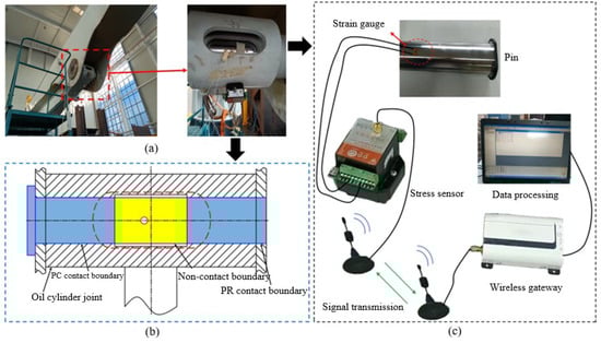The test equipment includes strain gauges, stress sensors, signal transmission systems, and data processing systems. These components collectively form a complete experimental testing platform for measuring and analyzing the stress variations in the pin shafts under different operating conditions. Based on the characteristics of the pin shaft failure and the direction of bending deformation, the strain gauges are strategically placed at the upper and lower surfaces of the oil passage hole on the pin shaft, oriented along the shaft’s axis, as shown in Figure 7a,b. This arrangement ensures accurate and effective real-time monitoring of stress results during the loading process. To achieve real-time data monitoring and transmission, the strain gauges are connected to the stress sensors via wires [23]. The stress sensors convert the stress signals detected by the strain gauges into transmissible electrical signals, which are then transmitted via a wireless system to the data processing system. The complete signal transmission process is illustrated in Figure 7c. The data processing system consists of a computer and specialized software, designed specifically for receiving, storing, and analyzing signals transmitted from the stress sensors. It enables real-time display of stress variations in the pin shaft, processes and analyzes the acquired data, and selects the maximum stress value as the experimental result.
