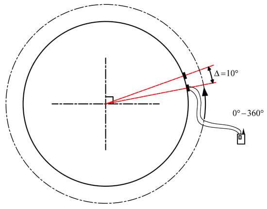 First, assemble all structural components. On both the boom side plate and the pin shaft surface, mark reference points for angle alignment. During the installation of the pin shaft, ensure precise alignment with these reference points. The initial installation angle of the oil passage hole is set to 0° (the oil passage hole axis forms a 0° angle with the +X axis). Considering that excessive loads can lead to shaft bending deformation, thereby increasing the difficulty of installation angle adjustment, a staggered loading scheme is designed: the load is incrementally increased from 0 kN to 100 kN (multiple pre-loading cycles are performed to ensure that the stress at the oil passage hole does not exceed the material yield strength of 650 MPa under a 100 kN load), and then slowly reduced to 0 kN. This loading cycle is repeated three times to ensure data reliability. During the loading process, stress data monitored by the strain gauges are collected in real-time through the stress sensors and signal transmission system. Subsequently, the installation angle of the pin shaft is sequentially adjusted to 10°, 20°, and so on, up to 360° (the rotation direction is shown in Figure 8). After each angle adjustment, the aforementioned loading and data acquisition process is repeated. After completing the tests for the first pin shaft, it is removed, and the entire testing procedure is repeated for the second and third pin shafts in sequence until all test specimens have been fully tested.