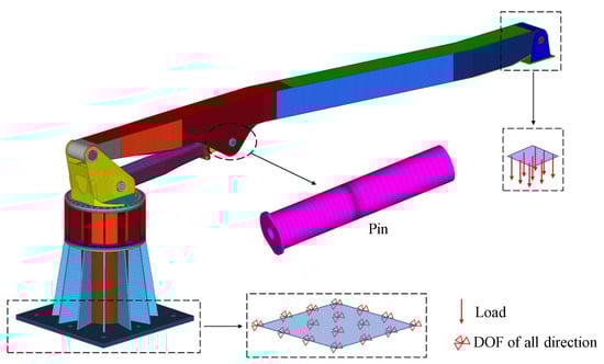The boom and connecting rod are simulated using SHELL181 shell elements, which are suitable for thin-walled structures and effectively model the mechanical behavior of box-type structures welded from plates under actual operating conditions. To accurately simulate the force transmission between the pin shaft and bushing, contact element pairs (CON173 contact elements and TAG170 target elements) are employed to model the nonlinear behavior of contact force transmission [27]. The turntable and components below it are simulated using SOLID185 solid elements. The entire finite element model, as shown in Figure 9, consists of 325,949 elements.