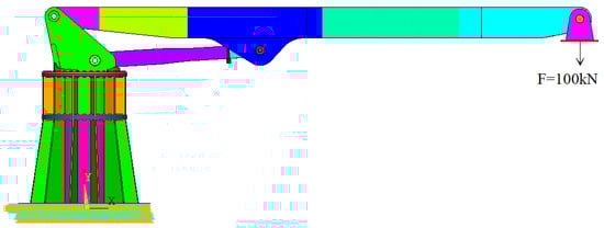 In this simulation model, displacement boundary conditions are applied to the base bottom (located at the lower left of Figure 10) to ensure the stability and immovability of the base during loading. The boom, turntable, connecting rod, and load application fixture are connected through three-dimensional solid pin contact settings, ensuring rotational freedom between all structural components.