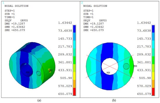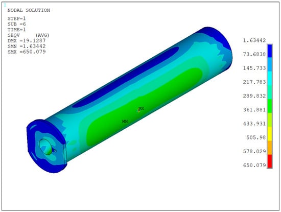 When the installation angle of the pin hole is set to 0°, the overall stress distribution characteristics of the structure can be intuitively presented through the stress cloud diagram shown in Figure 11. From the color gradient and numerical annotations of the stress cloud diagram, it can be observed that under this condition, the deformation mode of the pin structure is primarily bending deformation, with no significant torsional or shear deformation occurring. Additionally, the stress distribution exhibits a pronounced localized concentration phenomenon, and the area of maximum stress is precisely located at the edge of the oil hole. Due to the structural discontinuity of the oil hole, a stress concentration effect occurs at this location. According to the data obtained from the stress cloud diagram and calculations, the maximum stress value at this point reaches 650 MPa. This area needs particular attention to ensure that the structural strength meets the design service requirements.