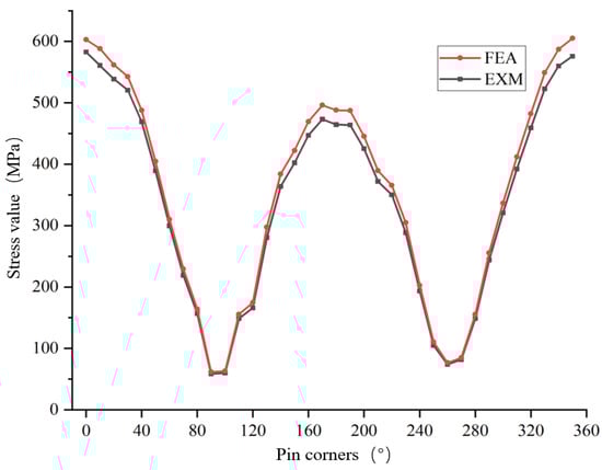 (2) Plotting the stress test values and simulation values from 0° to 350° (in 10° intervals) as point-line diagrams (as shown in Figure 13), the distribution of data points and the curve fitting effect indicate that the stress values from both sources remain highly consistent at all angles, with deviations falling within a small range. This visually demonstrates the consistency between the test and simulation results. Additionally, as the pin rotation angle changes, the stress values exhibit a significant periodic fluctuation characteristic: stress reaches its peak at angles of 0°, 180°, and 360° (corresponding to 0°), and its trough at 90° and 270°, forming a “two peaks and two valleys” periodic distribution pattern. Further comparison with the high-stress zone distribution characteristics when the oil hole installation angle is 0° reveals that regardless of the pin’s rotation angle, the high-stress zones consistently concentrate near 0° and 180°. This indicates the stability of the periodic characteristics in the pin’s stress distribution across different rotation angles, with the high-stress zones remaining fixed. The essence of this phenomenon lies in the load transmission path of the cylinder axis direction: when the oil hole installation angle is 0°, the load transmission path from the cylinder axis directly acts on the pin’s horizontal plane, making the stress concentration effect in that direction more pronounced. Even if the pin rotates, as long as the spatial position of the cylinder axis remains unchanged, the relative relationship of the load transmission path to the pin’s geometric symmetry remains constant, ultimately resulting in the high-stress zones consistently concentrating near 0° and 180°, in line with the cylinder axis direction. This verifies the decisive role of the load transmission path in the pin’s stress distribution.