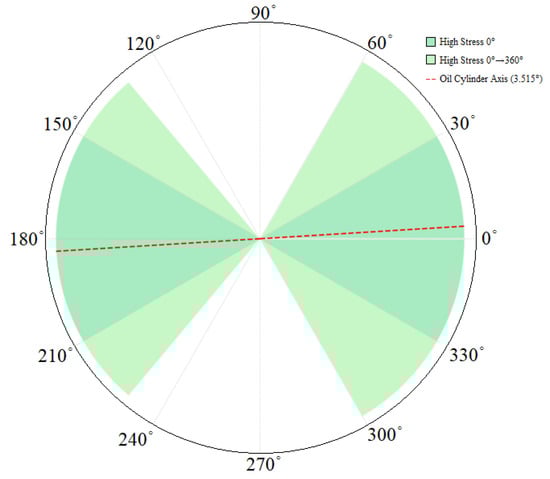 (3) By extracting the bolded numbers in Table 4 and Table 5 that represent high-stress states, the range of high-stress zones for the pin under a full 360° rotation was statistically determined and compared with the high-stress zones at a 0° installation angle. The results, as shown in Figure 14, reveal significant overlap between the high-stress zones at 0° and those occurring throughout the 0° to 360° rotation process, indicating the stability of the core distribution range of high-stress zones. Additionally, Figure 14 clearly shows that the cylinder axis (at an angle of 3.515°) forms a straight line span through the entire high-stress zone, with the high-stress zones remaining symmetrically concentrated around this axis regardless of the pin’s rotation angle. This further verifies the dominant role of the cylinder axis in the distribution of high-stress zones. Based on this analysis, to avoid stress concentration and potential failure risks associated with high-stress zones, the pin installation angle can be adjusted to the intervals [60° to 130°] and [230° to 300°]. These intervals avoid the high-stress concentration zones symmetric about the cylinder axis, effectively reducing the probability of structural failure due to stress concentration and providing crucial technical guidance for the installation and adjustment of pump truck pins.