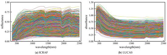 Original spectral reflectance curve. (a) curve of ICRAF-ISRIC dataset (3501 samples). (b) curve of LUCAS-ESDAC dataset (15,762 samples).