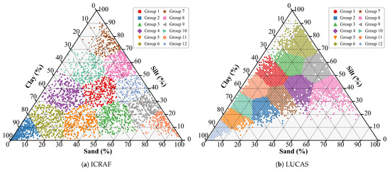 To evaluate model performance, this study employed a 3-fold cross-validation strategy, with the final results reported as the average performance metrics of the 3 folds. To ensure a uniform sample distribution, the K-Means [44] clustering algorithm was applied to the three soil texture properties (clay, silt, and sand), partitioning all samples into 12 clusters, as shown in Figure 2. During dataset construction, samples were allocated to the training and test sets on a cluster-by-cluster basis.