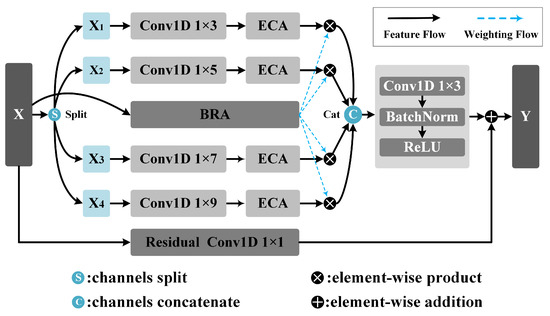 The two MASR modules divide the channels of the input feature X into four groups of equal size, with 8 and 16 channels in each group. The convolution operation doubles the number of channels to 16 and 32, and the number of channels after splicing in the channel dimension is 64 and 128. It utilizes convolutional kernels of varying lengths (1 × 3, 1 × 5, 1 × 7, 1 × 9) to capture features from receptive fields of different scales and doubles the number of channels, thereby enhancing the model’s multi-scale representation capability. Each convolutional branch is followed by an Efficient Channel Attention (ECA) [39] module.