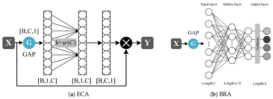 The structure of ECA and BRA modules. (a) the Efficient Channel Attention (ECA) modules. (b) the Branch Routing Attention (BRA) modules.