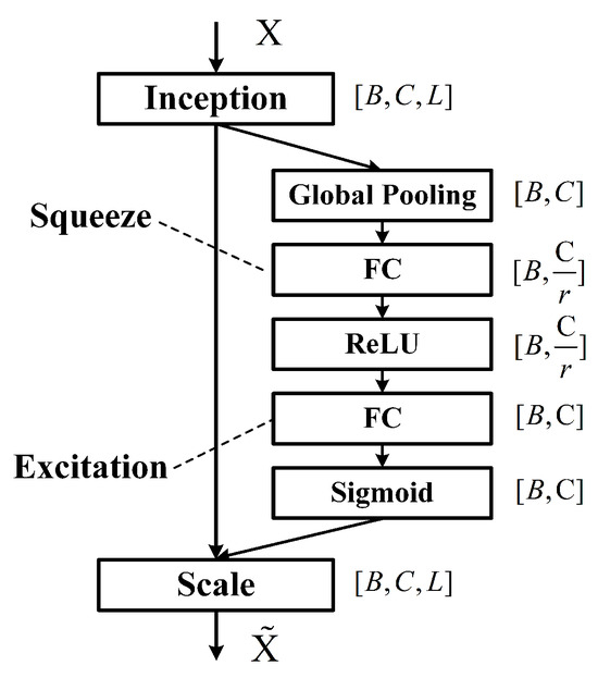After the grouped convolutions, the feature sequences from all groups are concatenated along the channel dimension, effectively doubling the number of channels compared with the input. The concatenated features are then processed by a convolution followed by BN and a ReLU activation layer, enhancing local spectral feature representation while maintaining training stability. To facilitate residual learning, a convolution is applied to the input to match the channel dimension, and a residual connection is added. Subsequently, the features are fed into an Squeeze-and-Excitation (SE) block (as shown in Figure 7) to recalibrate channel-wise importance, emphasizing informative spectral channels.