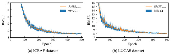 Training convergence curves of the MSRA-MT model. (a) from the ICRAF-ISRIC dataset and (b) from the LUCAS-ESDAC dataset. The solid lines represent the average RMSEs of the three tasks, and the semi-transparent intervals are the 95% confidence intervals.
