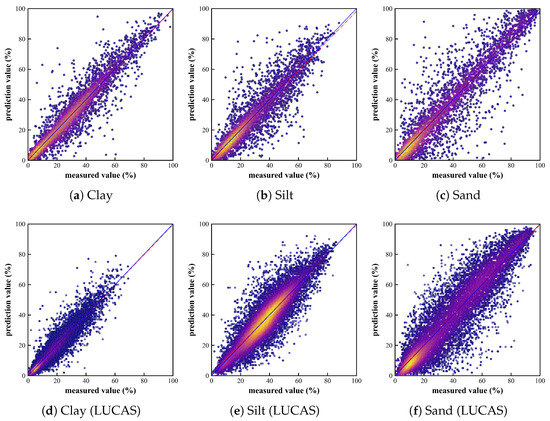 Scatter plots of predicted vs. observed values for three tasks by MSRA-MT-Net. (a–c) ICRAF-ISRIC dataset, showing results for: (a) clay; (b) silt; and (c) sand. (d–f) LUCAS-ESDAC dataset, showing results for: (d) clay; (e) silt; and (f) sand. The plot superimposes the prediction results from all three folds of the cross-validation. The X-axis and Y-axis correspond to the measured value and the predicted value, respectively, ranging from 0% to 100%. The blue lines represent the 1:1 lines, and the red lines represent the regression lines.
