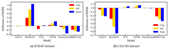 The multi-task learning paradigm of the MSRA model (MSRA-MT) outperforms the single-task version (MSRA-ST) in both performance and stability, demonstrating the ability to leverage the intrinsic correlations among tasks effectively. Experimental results based on the ICRAF and LUCAS datasets are in accordance with the conclusion. On the ICRAF dataset, the Mean Squared Error (RMSE) of the MSRA-MT for the Clay, Silt, and Sand prediction tasks was reduced by 2.8%, 3.9%, and 7.8%, respectively. Similarly, on the LUCAS dataset, the RMSE was reduced by 2%, 7.2%, and 3.2%, respectively. On average, the RMSE of the MSRA-MT was reduced by 5.22% on the ICRAF dataset and 4.44% on the LUCAS dataset. Concurrently, the standard deviation of the average metrics for the MSRA-MT version was also significantly lower than that of MSRA-ST, indicating that the proposed model’s prediction results are more stable. To examine the performance difference between MSRA-MT and MSRA-ST, we performed a paired t-test on the results of 10 repeated experiments in two groups. For the ICRAF and LUCAS datasets, the t-statistic values corresponding to the mean difference in RMSE for the three tasks were −9.223 (p-value < 0.001) and −27.537 (p-value < 0.001), respectively. The t-values corresponding to the mean difference in were 11.005 (p-value < 0.01) and 19.846 (p-value < 0.001), respectively.
