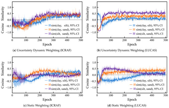 However, most researchers have employed a single-task modeling strategy, in which the contents of clay, silt, and sand are predicted independently. Such approaches fail to fully exploit the intrinsic constraints and correlations among the three components, which often leads to inconsistent prediction results [31]. In contrast, multi-task learning (MTL) employs a compact shared model to simultaneously learn multiple related tasks [32,33], thereby facilitating knowledge transfer and enhancing overall generalization capacity [34,35]. This approach enables better capture of the coupled relationships among soil texture components and improves the model’s generalization performance. However, multi-task learning methods are prone to the “negative transfer” problem [36,37], and the model struggles to achieve satisfactory accuracy across all tasks due to the lack of an effective task weight balancing mechanism [38].