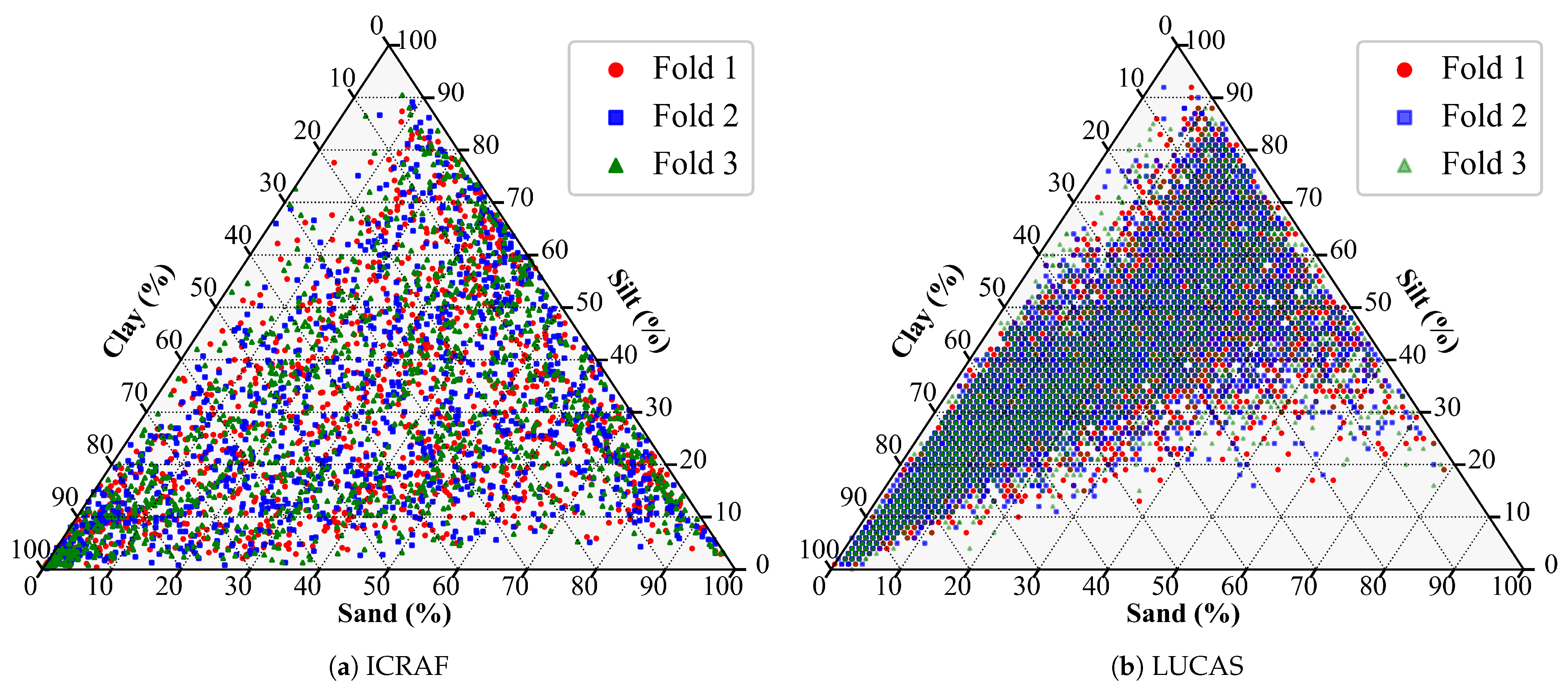 The ICRAF (International Center for Research in Agroforestry) soil dataset comprises 4438 soil samples from 58 countries across five continents. The samples were subjected to standardized laboratory processing, including air-drying and passing through a 2 mm sieve. The percentage contents of clay, silt, and sand were determined according to standardized procedures, with values ranging from 0% to 100%. Spectral data were acquired using a FieldSpec FR spectroradiometer, covering a range of 350–2500 nm with a spectral resolution of 1 nm. The LUCAS (Land Use/Cover Area Frame Survey) topsoil database, initiated in 2009, covers 19,036 standardized topsoil samples from 23 EU member states. These samples also underwent rigorous standardization procedures to determine the percentage contents of clay, silt, and sand. Spectral data were obtained in diffuse reflectance mode by using a FieldSpecXDS hyperspectroradiometer. The acquired raw spectra were subsequently interpolated and normalized, resulting in a spectral range of 400–2500 nm with a spectral resolution of 0.5 nm.