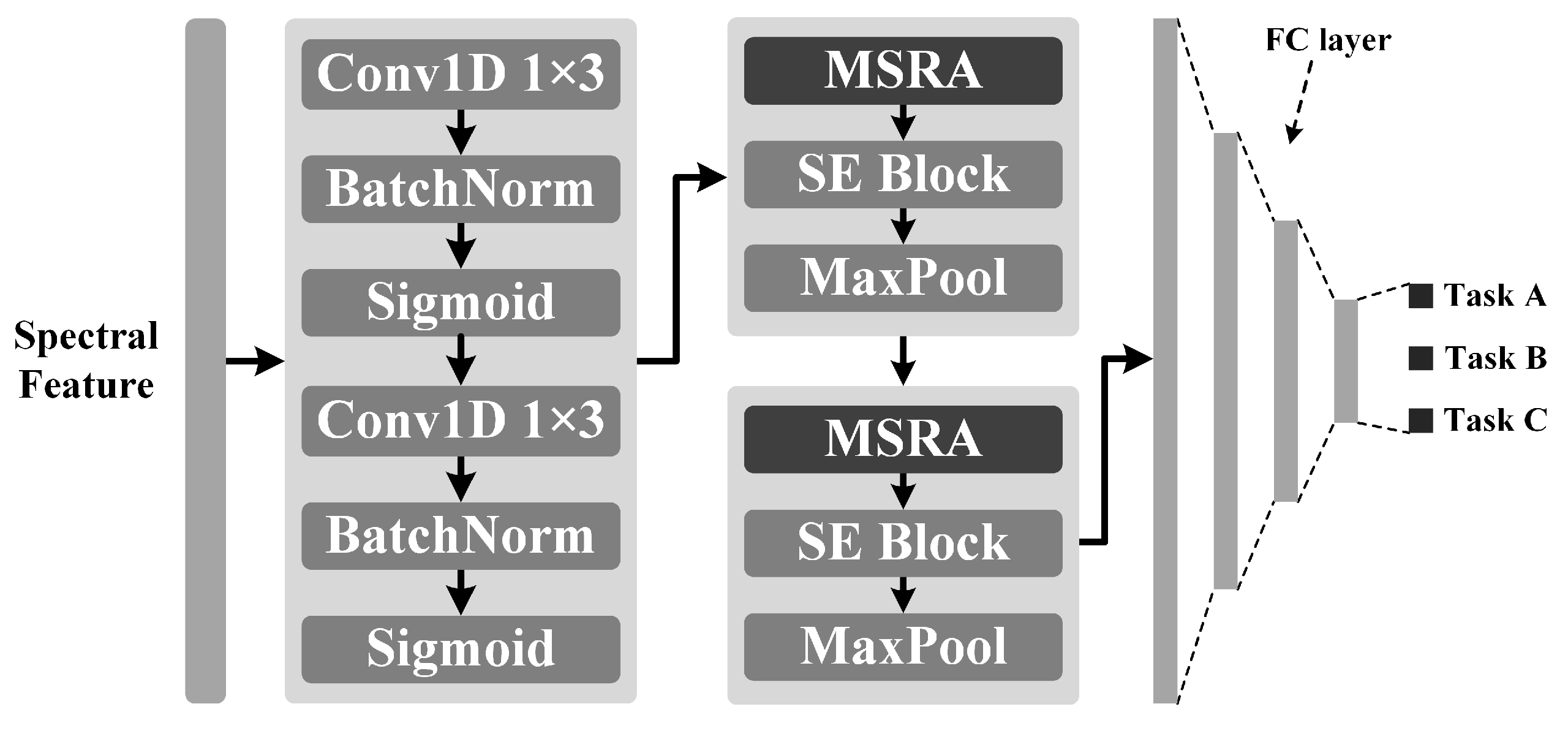 The model takes a spectral sequence with 128 features as input. The input is first processed by two consecutive 1D convolutional layers (), which expand the number of channels to 32 while extracting preliminary features, which serve to extract features and perform initial noise suppression. Each convolutional layer is followed by a Batch Normalization (BN) layer and a Sigmoid activation layer, which enables the progressive extraction of more abstract features and enhances the model’s nonlinear representational capability.