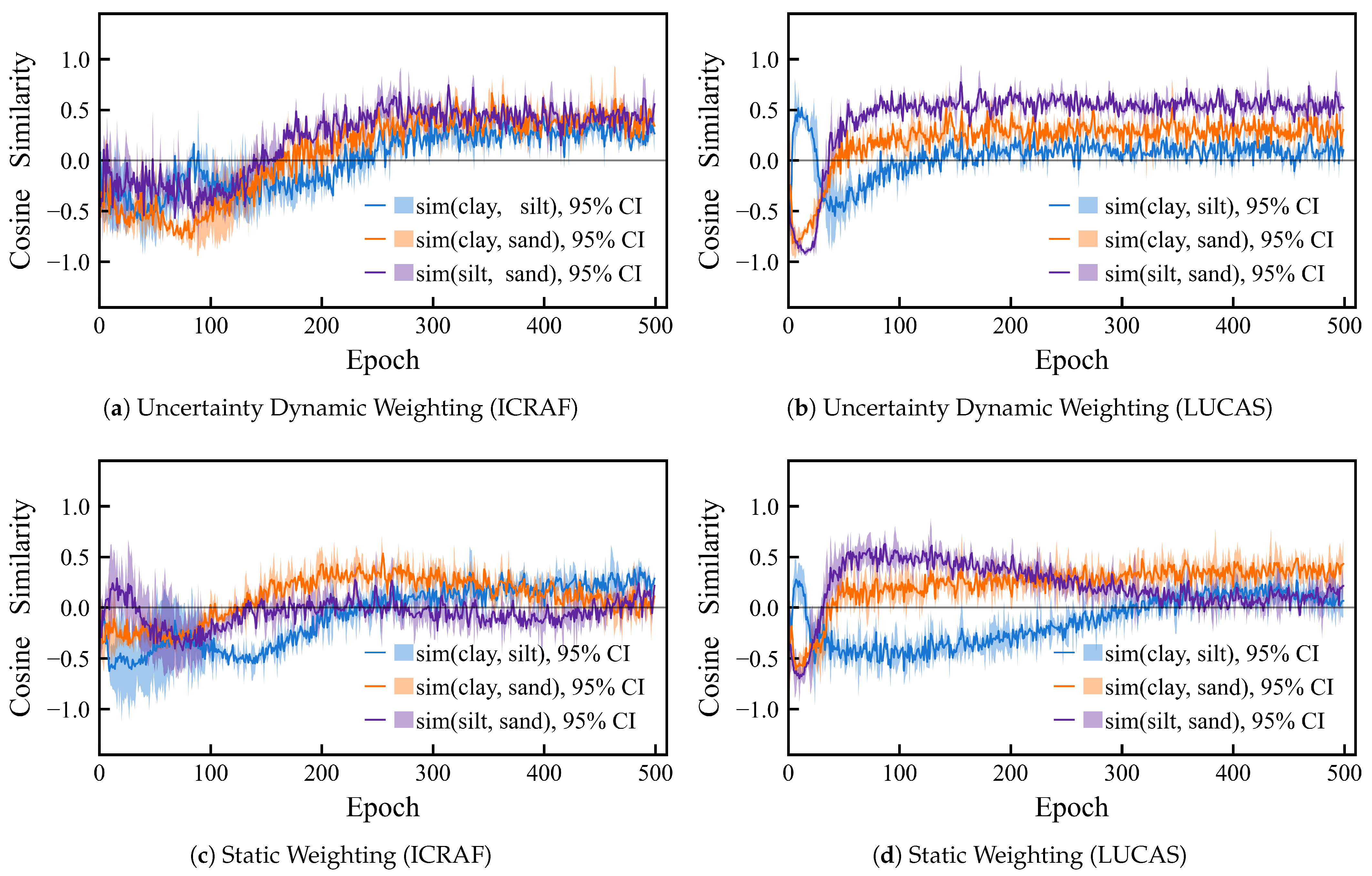 This consistent hierarchy strongly suggests that the intrinsic uncertainty and noise level of the individual tasks govern the distribution of the correction. Specifically, the prediction of sand is inherently the most uncertain (or noise-prone) due to its weaker spectral characteristics. Consequently, to minimize the overall closure error of , the multi-task model preferentially allocates the largest corrective or optimization gradient updates to the most volatile task (Sand), where the correction yields the maximum reduction in the soft constraint loss. While this strategy aims for the most effective overall error minimization, it simultaneously causes the optimization process to be dominated by the noisy task, leading to potential optimization conflict among the tasks. This finding highlights the necessity of employing an inter-task optimization conflict mitigation strategy to ensure that the constrained optimization does not disproportionately sacrifice the performance of one task for the benefit of the constraint.