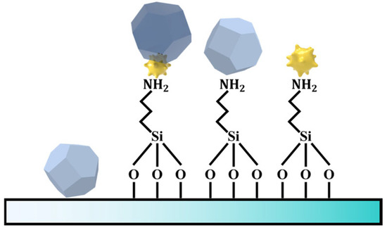 Schematic illustration of the substrate fabrication process. The glass surface was first functionalized with 3-aminopropyltriethoxysilane, forming—NH2 groups on the substrate. These amino groups enabled the electrostatic adsorption of nanoparticles (e.g., ZIF-8 crystals and Au nano-urchins), resulting in the formation of a functionalized plasmonic sensing surface.