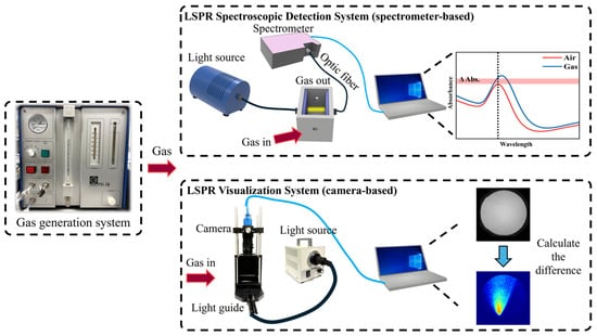 Schematic of the experimental platforms: gas generation system (left), localized surface plasmon resonance (LSPR) spectroscopic detection system (top right), and LSPR visualization system (bottom right). The spectrometer-based LSPR system measures transmittance spectra through the gas chamber, and the dashed line in the inset indicates the wavelength position used for calculating the absorbance change (). The camera-based system captures transmission images to visualize spatial gas distributions by differential image processing, where the pseudo-color mapping (cv2.COLORMAP_JET) represents the magnitude of transmittance change—red indicates stronger changes and blue indicates weaker changes.