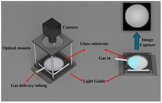 Two experimental configurations were used to visualize the gas distributions using the camera-based LSPR system, as shown in Figure 3 and Figure 4. For both setups, a light guide was positioned beneath the glass substrate to generate uniform illumination, and a camera mounted on top captured transmission images for subsequent analysis.