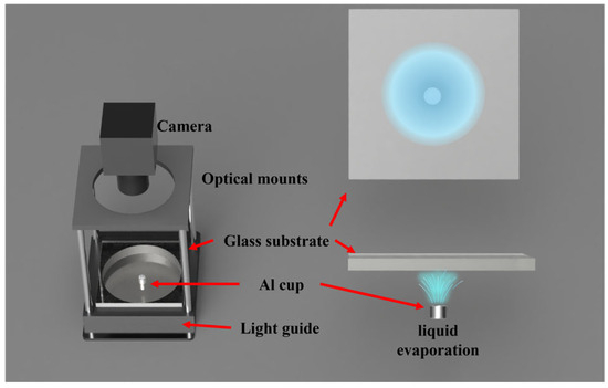 In the second experimental configuration (Figure 4), the gas source was produced by natural evaporation of a liquid droplet. A small aluminum cup (5 mm diameter) was placed between the substrate and the light guide. The glass substrate was mounted facing downward above the cup, into which 30 μL of liquid was dispensed. The liquid gradually evaporated into the surrounding air. Transmission images were continuously captured for 36 min (3600 frames in total).