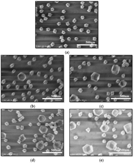 The surface morphologies of the Au nano-urchin substrates prepared with different ZIF-8 growth times were examined by scanning electron microscopy (SEM, SU8000, Hitachi High-Technologies Corp., Tokyo, Japan) (Figure 5a–e). Before ZIF-8 deposition, the Au nano-urchins exhibited an average diameter of ~90 nm with sharp protrusions and appropriate interparticle spacing (Figure 5a), features that are favorable for strong plasmonic coupling. After 30 min of ZIF-8 growth, ZIF-8 crystals with rhombic dodecahedral morphology (~200 nm in diameter) appeared on the substrate (Figure 5b). With increasing immersion time, the density of ZIF-8 crystals progressively increased (Figure 5c,d). For 120 min ZIF-8 growth (Figure 5e), the particle density was comparable to that observed for 90 min ZIF-8 growth, suggesting that the ZIF-8 growth had reached saturation. Additional large-area SEM images are provided in the Supplementary Information (Figure S1), showing that the ZIF-8 crystals have uniform particle sizes and that only the deposition density varies with growth time. These results confirm the consistent quality and uniformity of the ZIF-8 layer obtained at 90 min growth.