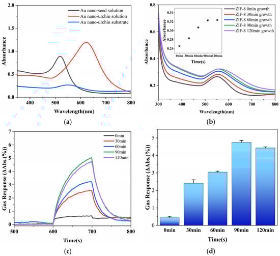 Optical and gas sensing characterization of the ZIF-8-modified Au nano-urchin substrates. (a) Ultraviolet–visible absorption spectra of the Au seed solution (plasmon peak at 519 nm), Au nano-urchin colloid (red-shifted to 622 nm), and Au nano-urchins deposited on glass (551 nm). (b) Absorption spectra of the substrates after different ZIF-8 growth times (0, 30, 60, 90, and 120 min), showing a progressive red-shift and increased absorbance up to 90 min, followed by saturation (the insert shows the peak absorbance versus the growth time). (c) Real-time gas responses at 558 nm for the five substrates exposed to 381 ppm 2-pentanone (600 s air baseline, gas exposure for 100 s, and then air purging). (d) Average responses during the final 20 s of gas exposure, indicating that the 90 min ZIF-8-coated substrate exhibited the maximum response.