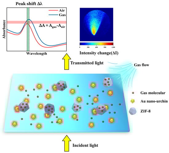 A schematic illustration of the sensing mechanism of the Au nano-urchin/ZIF-8 substrate is shown in Figure 7. The Au nano-urchins (yellow spiky particles) generate localized surface plasmon resonances at their sharp tips, forming electromagnetic “hot spots” that are highly sensitive to the refractive index of the surrounding medium. The ZIF-8 crystals (blue polyhedra), with a porous rhombic-dodecahedral structure, enrich gas molecules (red spheres) near these plasmonic regions. Upon gas exposure, the adsorbed molecules increase the local refractive index around the Au nano-urchins, perturbing the resonance coupling between incident light and the collective oscillation of conduction electrons. This perturbation manifests as measurable optical signal changes in two modes. In the spectrometer-based LSPR system, the transmitted spectra exhibit either a resonance peak shift () or an absorbance variation () at a selected wavelength. In the camera-based LSPR imaging system, the same plasmonic modulation is captured as pixel-wise intensity differences () in monochromatic transmission images, enabling spatially resolved visualization of the gas distribution. Thus, the local refractive-index modulation induced by molecular adsorption is directly converted into the observed spectral or intensity variations. The synergistic effect of plasmonic field enhancement from Au nano-urchins and molecular enrichment by ZIF-8 accounts for the amplified and reproducible gas responses observed experimentally.