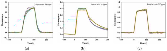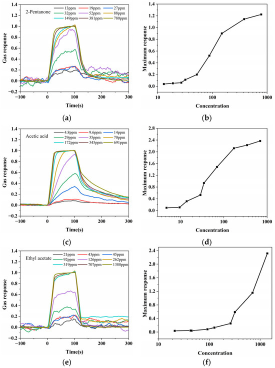 For 2-pentanone (Figure 8a), acetic acid (Figure 8c), and ethyl acetate (Figure 8e), the normalized dynamic response curves clearly showed that higher analyte concentrations led to faster response increases when the gas flow was switched on at 0 s. Despite differences in absolute intensity, normalization allowed a direct comparison of the response kinetics for all concentrations, while weaker raw responses were appropriately compressed for clarity.