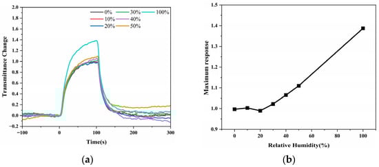 The effect of ambient humidity on the sensor response was evaluated using 2-pentanone as a representative analyte (Figure 10a,b). Measurements were conducted under controlled relative-humidity levels of 0%, 10%, 20%, 30%, 40%, 50%, and 100%. The LSPR signal at 600 nm showed rapid and reversible variations during gas exposure (0–100 s) and purging for all humidity levels. As summarized in Figure 10b, the response magnitude changed only slightly below 20% RH, whereas a linear dependence (y = 0.53x + 0.8552) was observed above this range. These results indicate that the ZIF-8–modified substrate exhibits good humidity tolerance and a predictable linear behavior under higher humidity conditions. At normal ambient temperatures, the refractive-index variation in air and the corresponding shift in the localized surface plasmon resonance spectrum are far smaller than the gas-induced signal magnitude, indicating that temperature fluctuations have a negligible influence on the sensing performance under typical laboratory conditions.