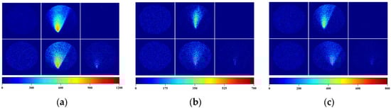 Visualization of 381 ppm 2-pentanone generated from a 20 mL glass vial at a 0.5 L/min flow rate is shown in the first row of Figure 11a. The initial differential image showed a uniform baseline (left panel). After 60 s of gas exposure, a bright conical region appeared (middle panel), with the highest intensity at the nozzle impingement area and a gradual decrease in the intensity with the distance from the nozzle, clearly visualizing the upward-directed gas plume. Upon switching back to clean air for ~60 s, the response largely recovered to the pre-exposure state (right panel). The second row in Figure 11a shows the response to 149 ppm 2-pentanone at a 1.0 L/min flow rate. Compared with the findings with the higher 2-pentanone concentration, the plume area and intensity were smaller, and the signal decreased more rapidly with the distance from the nozzle, which is consistent with the lower analyte concentration. The results of analogous experiments for acetic acid are shown in Figure 11b. The first row corresponds to 35 ppm acetic acid generated at 0.5 L/min using a D30 tube, while the second row corresponds to 17 ppm acetic acid generated at 1.0 L/min. In both cases, the conical gas plume was clearly resolved, but the higher acetic acid concentration (35 ppm) produced a larger and brighter response region than the lower acetic acid concentration (17 ppm). The results for ethyl acetate are shown in Figure 11c. The first row shows the results for 131 ppm ethyl acetate generated at 0.5 L/min, and the second row shows the results for 65 ppm ethyl acetate generated at 1.0 L/min. The same trend was observed: the higher ethyl acetate concentration produced a stronger and more extended response region, whereas the lower ethyl acetate concentration produced smaller, weaker plumes. Notably, in the experiments performed at the higher flow rate of 1.0 L/min (second rows of Figure 11a–c), a weak residual signal was observed in the gas-impingement region even after 60 s of air purging. This residual response can be attributed to the slight surface damage or perturbation of the substrate induced by the higher flow rate. Nevertheless, the effect was minor and did not significantly affect the overall sensing or visualization performance.