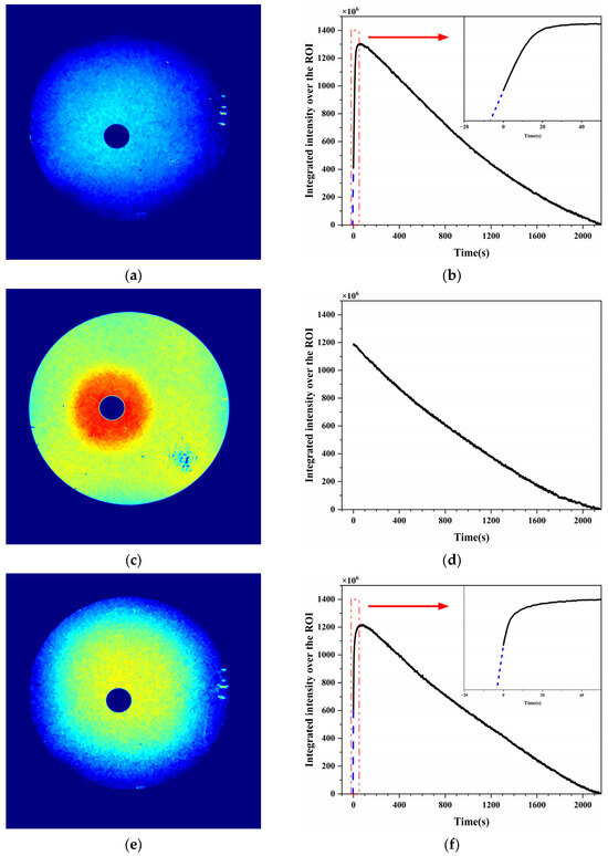 For 2-pentanone (Figure 12a,b), the initial differential heatmap (Figure 12a) showed a circular high-response region centered above the evaporation source, confirming upward diffusion of the vapor. The integrated intensity over the region of interest (ROI) rapidly increased at the beginning and reached a peak within the first few minutes. The early-stage response, which exhibited an approximately linear increase, is shown in Figure 12b’s insert. The dashed blue line was extrapolated from the linearly increasing region to estimate the plume growth prior to camera triggering. After reaching the maximum, the signal gradually decreased as the evaporation rate decreased.