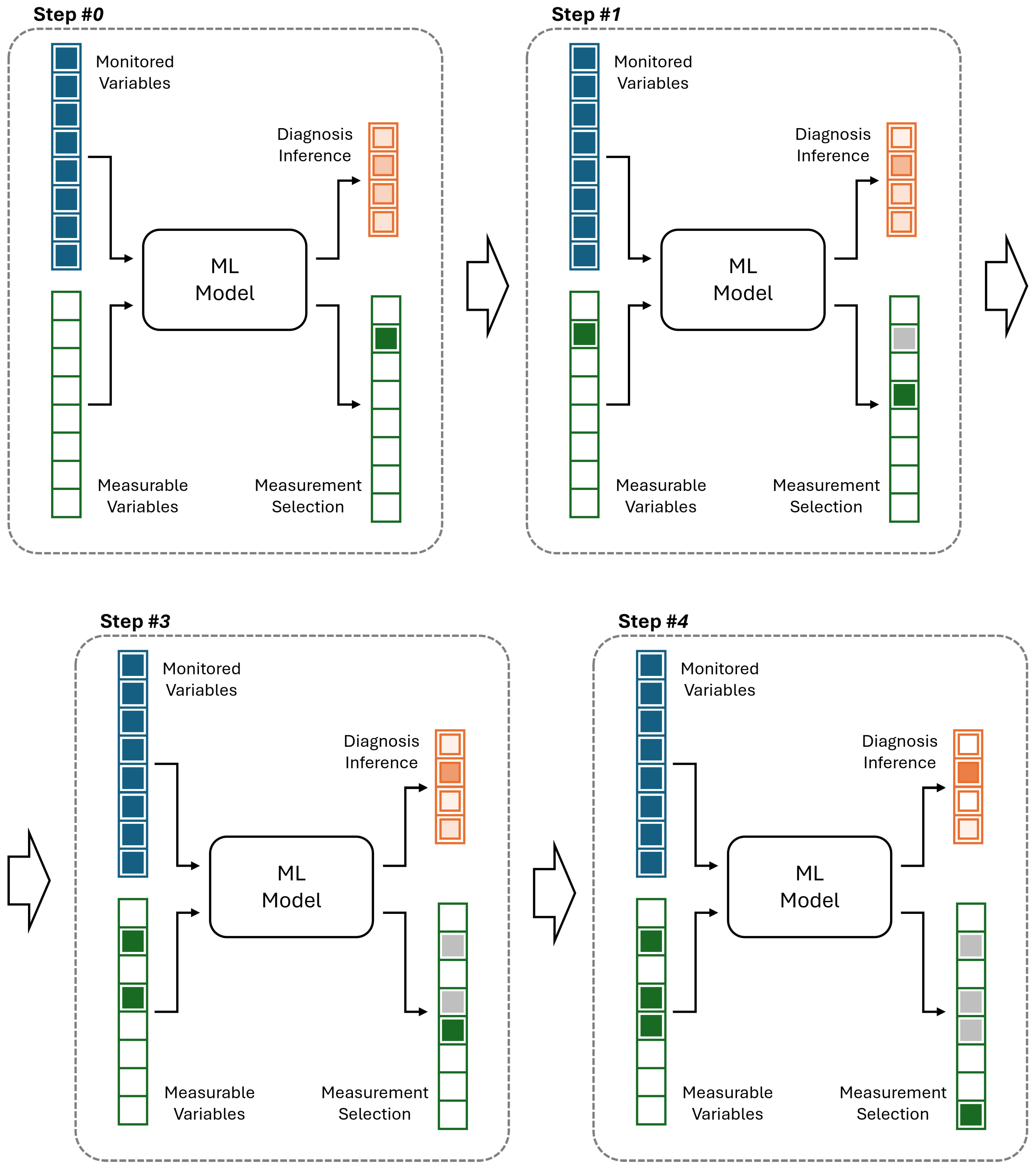 Figure 1. The model receives both monitored and measurable variables as inputs and produces two outputs: diagnostic inference and measurement selection for the robot. Each cluster of boxes represents a vector, with individual boxes denoting its elements. At measurement step #0, i.e., before the robot begins measurements, all monitored variables are available to the model, shown as filled boxes, while none of the measurable variables are yet available, shown as empty boxes. Using these inputs, the ML model generates diagnostic inference in terms of class probabilities, represented by color thicknesses, and simultaneously recommends which measurable variable should be collected next to maximize information gain, represented by a filled box among other empty boxes. At step #1, the model incorporates both the monitored variables and the newly measured variable from the previous step, yielding refined diagnostic inference and a new recommendation for the next measurement. Note that the number of candidate variables to be measured is reduced by one compared to the previous step, as one variable has already been measured and is represented by a gray box. This iterative process continues through subsequent steps. At each step, one additional measurable variable is incorporated, and the diagnostic inference becomes increasingly confident, as reflected by the progressively sharper distinctions in color thickness among class probabilities in the figure. The cycle repeats until the inference is sufficiently confident to support a final decision, which is not restricted to step #4 as it is in this example.
