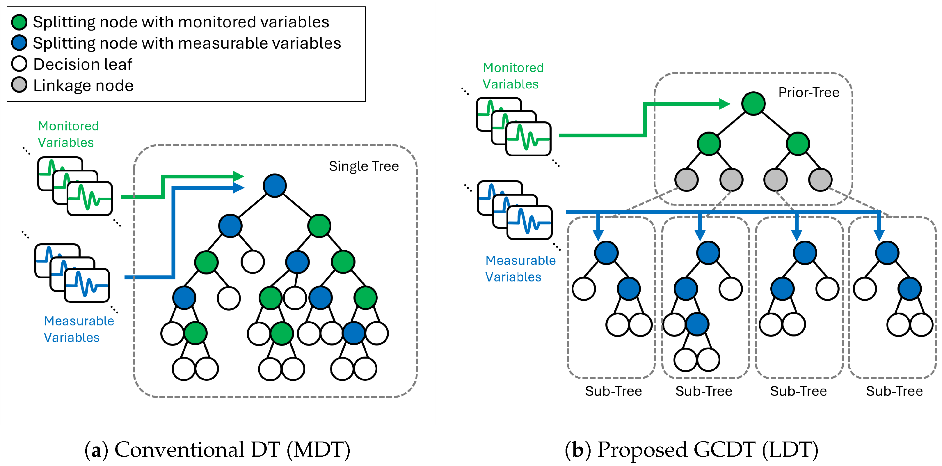 In this paper, two types of GCDT models are presented: a layered decision tree (LDT) and an adaptive decision tree (ADT). LDT, a two-layer tree model, feeds monitored variables and measurable variables into two different layers of trees, as illustrated in