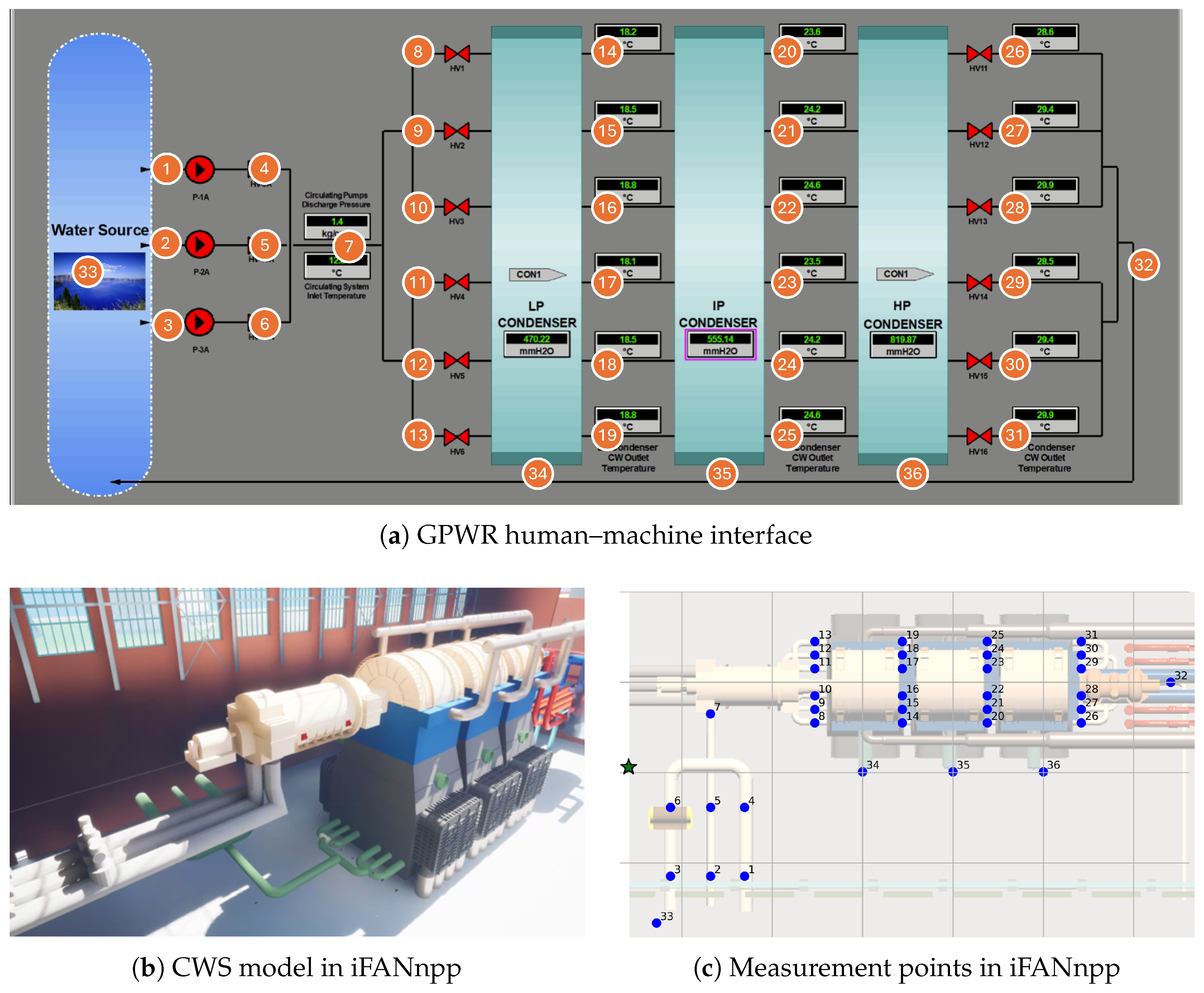 Figure 5a is the GPWR human–machine interface of the CWS. All measurement points where a robot can measure variables are plotted as round orange markers with point numbers on them. This CWS has 23 installed sensors on 19 temperature and 4 pressure variables, which are considered monitored variables in this study. It also has 70 additional measurable variables of pressure, temperature, flow rate, and pump load, of which data can be acquired at 36 physical locations. Detailed information on the variables and measurement points is listed in