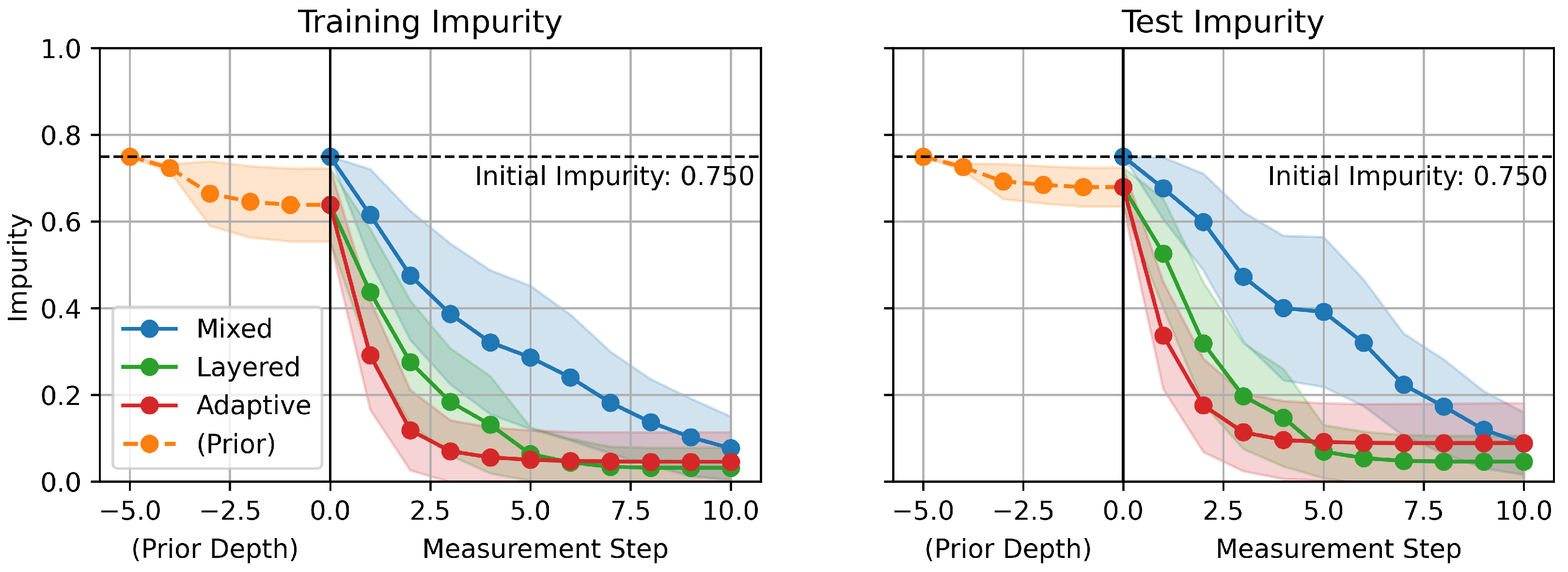 Figure 6, the impurity distinctively decreases over the measurement steps, which illustrates that the models become more confident in their prediction as measurements proceed. The proposed GCDT models demonstrate a significant advantage also in decreasing uncertainty of predictions faster in comparison to the MDT.