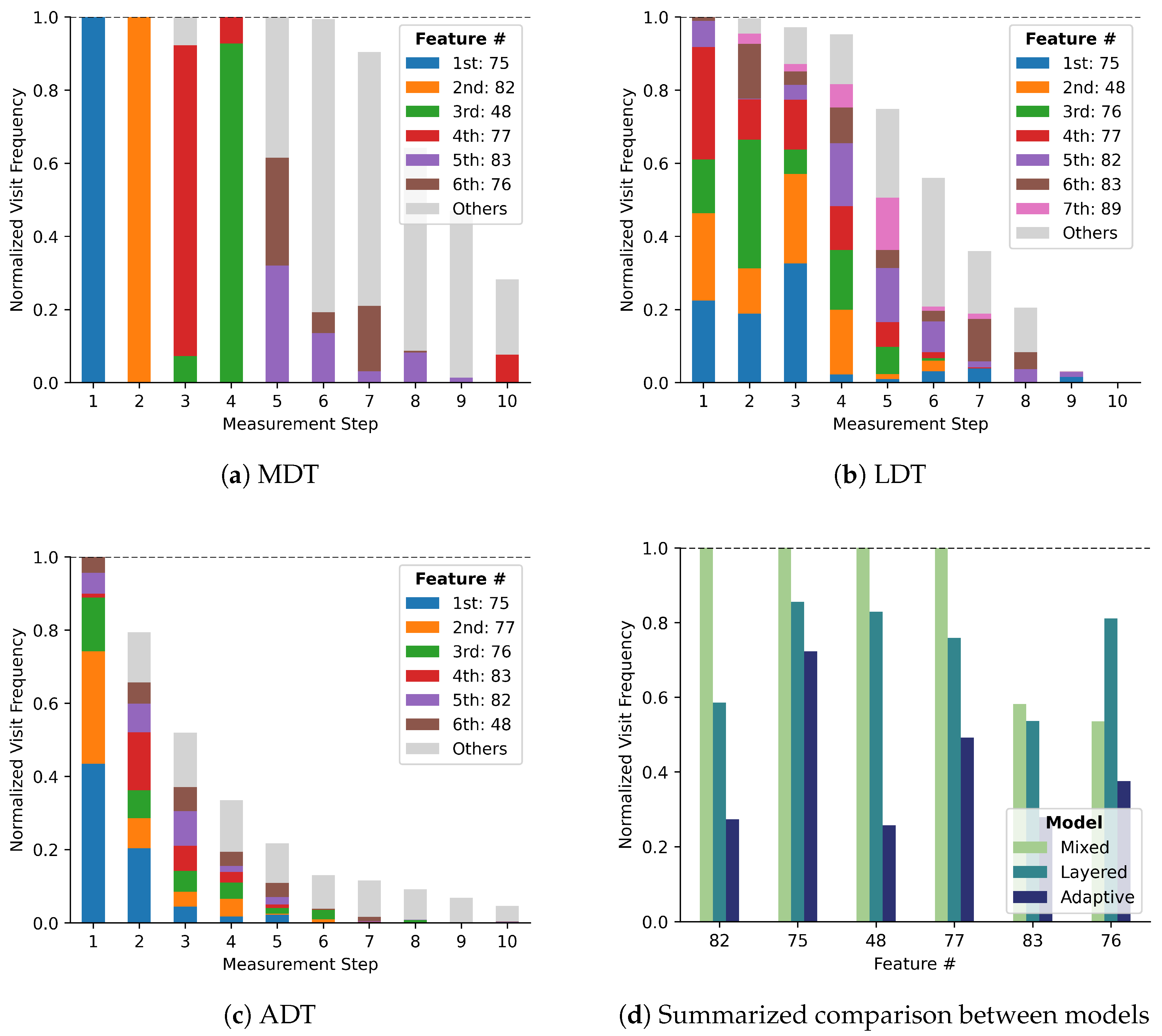 Figure 8a–c illustrates which variables are required by each model most frequently. The height of the bars represents the normalized frequency of being selected at each step, which could be up to 1.0. The six most frequently required features during inference are selected, and colors are assigned in the order of the total number of times they were selected over all measurement steps. Frequencies of all other features were aggregated and represented in the gray color bars.