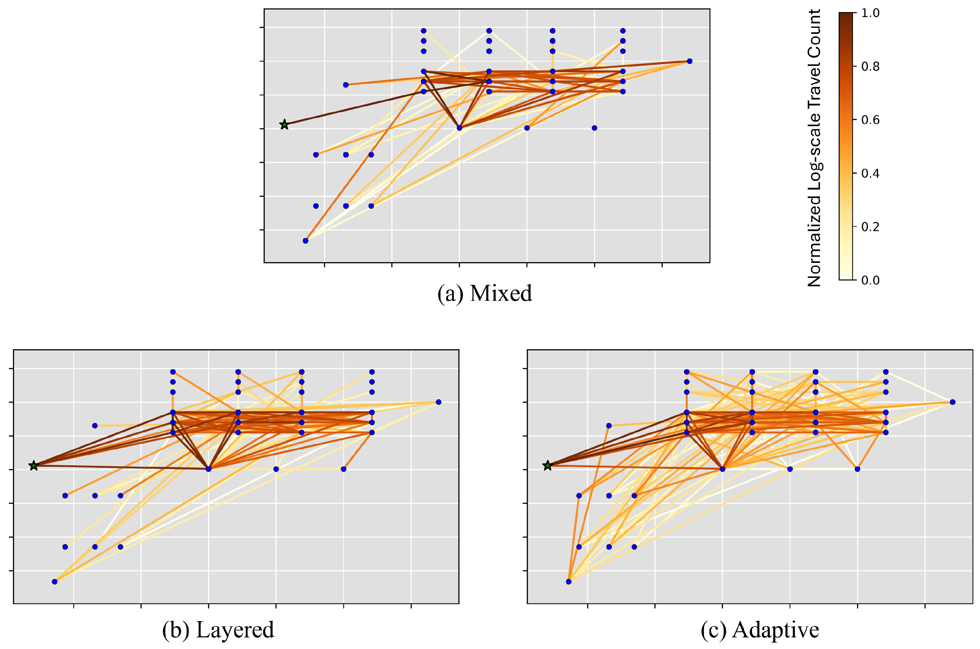 Figure 10 illustrates the traveled paths between the measurement points up to measurement step 5 in iFANnpp. The color represents normalized log-scale travel counts on the paths. GCDT models result in more diverse paths traveled by the robot (