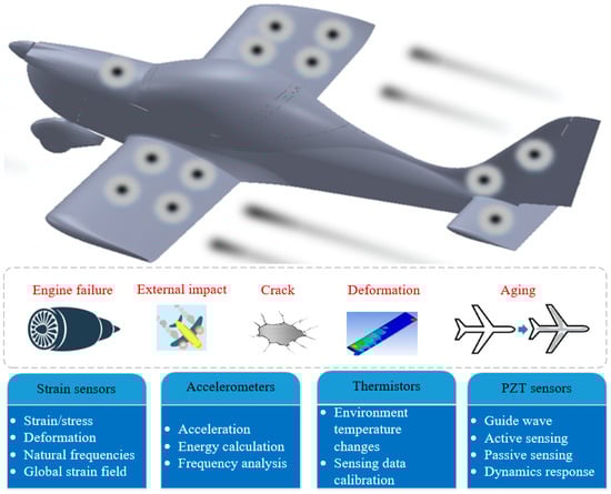With the widespread application of drones [] for climate monitoring and national defence, the level of intelligence within the aircraft [] is continuously being enhanced. Additionally, research into the performance monitoring of aircraft during flights is required to enable safety and maintenance to be enhanced. Among the research application scenarios of structural health monitoring, aircraft health monitoring has been reported in the academic literature in recent years [,]. Evidence suggests that monitoring various locations of an aircraft can provide valuable information for assessing the aircraft’s health condition [,]. Aircraft may encounter various failure scenarios or complex environmental changes during flight, such as wing impacts, cracks, abnormal engine speed and failure, deformation and ageing (see Figure 1). By employing sensors to measure real-time information such as the strain (and hence stress), vibration, deformation, temperature, speed, and acceleration of aircraft structures, structural issues with the airframe could be identified prior to failure. Major aircraft manufacturers like Boeing and Airbus have proposed full-scale fatigue tests and diverse SHM technology [,] in aircraft health monitoring, emphasising requirements such as large-scale deployments, lightweight sensors and processing equipment, low power consumption and continuous online monitoring.