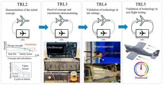 The technology readiness level (TRL) of the aircraft SHM digital twin platform can be viewed as progressing through a number of stages, from concept validation (i.e., TRL 2) to real flight conditions (i.e., TRL 5) as depicted in Figure 2. At TRL 2, the concept and validation methods are established [], while TRL 3 involves proof of concept in simple experimentation [] and via simulations. Advancing to TRL 4 and 5 requires increasingly realistic experimental conditions, including experiments in laboratory wind tunnel environments and real flight conditions, respectively, both involving real-time data acquisition [].