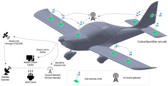 Distributed sensor nodes are to be deployed across multiple critical areas. Multiple nodes can be placed on the main wings to assess the structural health of key locations during flights. Scalability is key to adapting the number of sensor nodes in all locations as requirements change. Sensor nodes located on the main wing, engine, engine nacelle, tail wing and centre of gravity are integrated into a unified sensor network. The on-board gateway is designed to manage all distributed sensing nodes, supporting synchronisation of sensor data. Non-customised sensing nodes (not only commercially available off-the-shelf sensors, but, e.g., printed strain gauges) can also be wirelessly integrated into the network. All data collected from these nodes are transmitted to a cloud-based platform via satellite network, where it is processed, analysed and incorporated into the digital SHM twin. If required, key results can be fed back to the pilot for assessment and actioning.