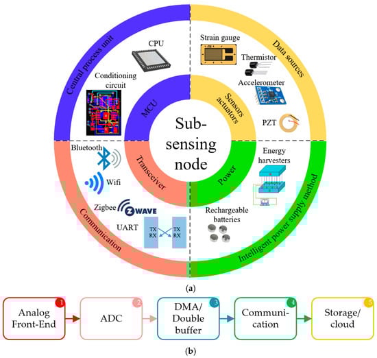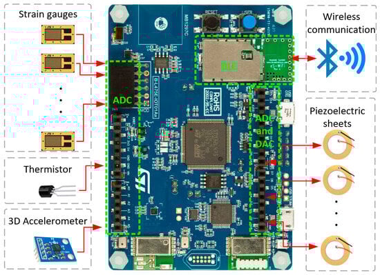 According to the requirements of the aircraft SHM digital twin platform, sub-sensing nodes consist primarily of four components: an MCU, one or more sensors and actuators, a transceiver and a power supply (e.g., rechargeable batteries and vibration energy harvesters), as is shown in Figure 5a. In this study, the B-L475E-IOT01A discovery board was chosen as the central processing unit []. The selected MCU is STM32L475VG, which is characterised by a maximum processing clock speed of 80 MHz, 16 Analogue-to-Digital Converter (ADC) channels and two DAC channels. It also includes 1 Mbyte of Flash memory and 128 Kbytes of SRAM. Additionally, the discovery board can supply 3.3 V to the sensors.