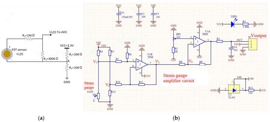 PZT and strain gauge conditioning circuit. (a) PZT sensor conditioning circuit. (b) Strain gauge amplifier circuit diagram.