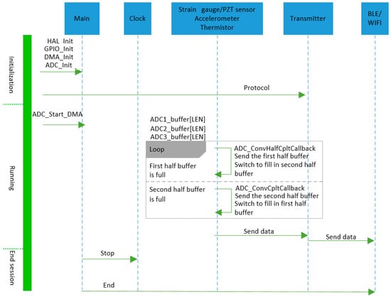 A Unified Modelling Language (UML) sequence diagram [] of the data acquisition software functionality, as depicted in Figure 8, illustrates the chronological sequence of events during the system’s operational cycle. The modules (i.e., clock, sensor signal, transmitter, and BLE/Wi-Fi) listed represent the system participants, while the timeline on the left-hand axis delineates the temporal sequence of programme execution into three phases: initialisation, running, and end session (i.e., termination).