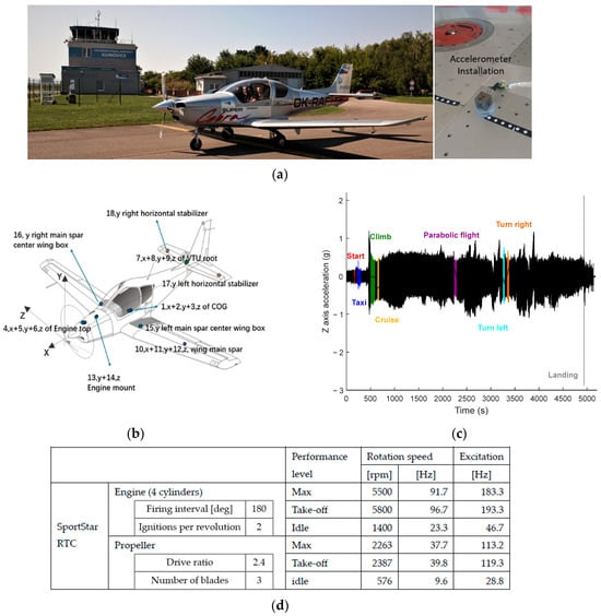 Acceleration data acquisition during real flight tests and the excitation source analysis. (a) Real flight test of Evektor‘s Cobra VUT100i aircraft at Kunovice airport. (b) Locations and orientations of 18 acceleration measurement channels. (c) Time history of acceleration of Engine mount in the Z axis during whole flight (key phases are highlighted by colour). (d) Analysis of excitation sources of SportStar RTC that affect the definition of the adequate sampling frequency.