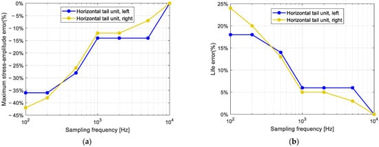 Evaluation of data loss and its projection into the fatigue life analysis for the original recorded signal at 10 kHz sampling frequency. (a) maximum stress-amplitude error. (b) life error.