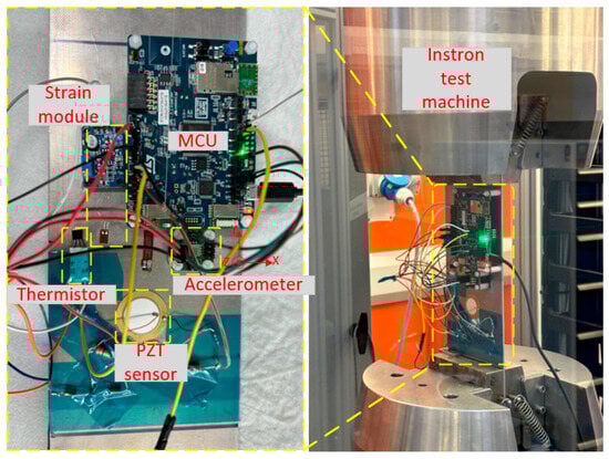 The experimental setup for testing the prototype multi-sensing system is depicted in Figure 11. To ensure that the prototype meets the size requirements of the Instron test machine, all components were arranged on a standard aluminium plate (300 mm × 100 mm × 2 mm), including the B-L475E-IOT01A MCU, a strain module containing a uniaxial strain gauge (BF350-3AA) and an amplification circuit, a PZT sensor to measure structural vibrations and impact-induced signals, and a conditioning circuit module that converts the PZT’s AC output into a 0–3.3 V signal suitable for ADC channel sampling, an EVAL-356CZ 3D accelerometer and an LM35-integrated temperature sensor. All modules were attached to the aluminium plate specimen using super glue, with the strain gauge and PZT sensor located near the centre. The ends of the aluminium plate specimen were clamped by the Instron machine. The Instron machine was activated to apply static loads from 0 to 15 KN. A UART terminal software (XCOM or Tera Term) on the laptop was employed to control the interface, receive, and log the sensor data for analysis.