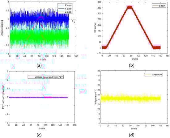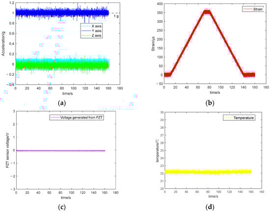 The data for 3D acceleration, strain, PZT voltage, and temperature are presented in Figure 12a–d, respectively. Note: The Y-axis of the accelerometer is parallel to the direction of gravity, resulting in a Y-axis measurement of 1 g. The sampling frequency of all ADC channels is 1094 Hz, and the ADC resolution is 12 bits.