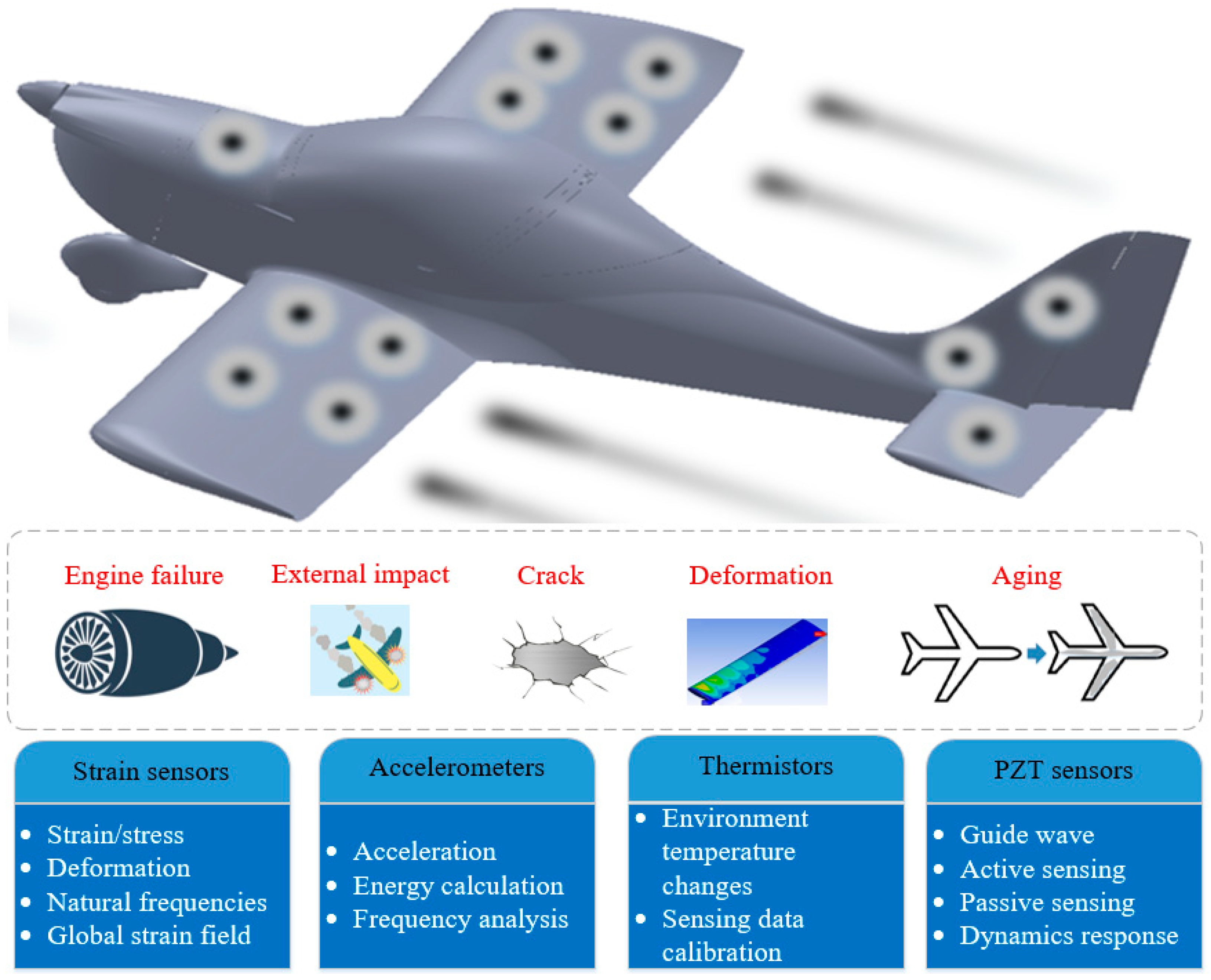 - A sensing system that can be utilised to monitor strain/stress values, dynamic characteristics, acceleration, acoustic emission and temperature simultaneously and continuously throughout complete flights.