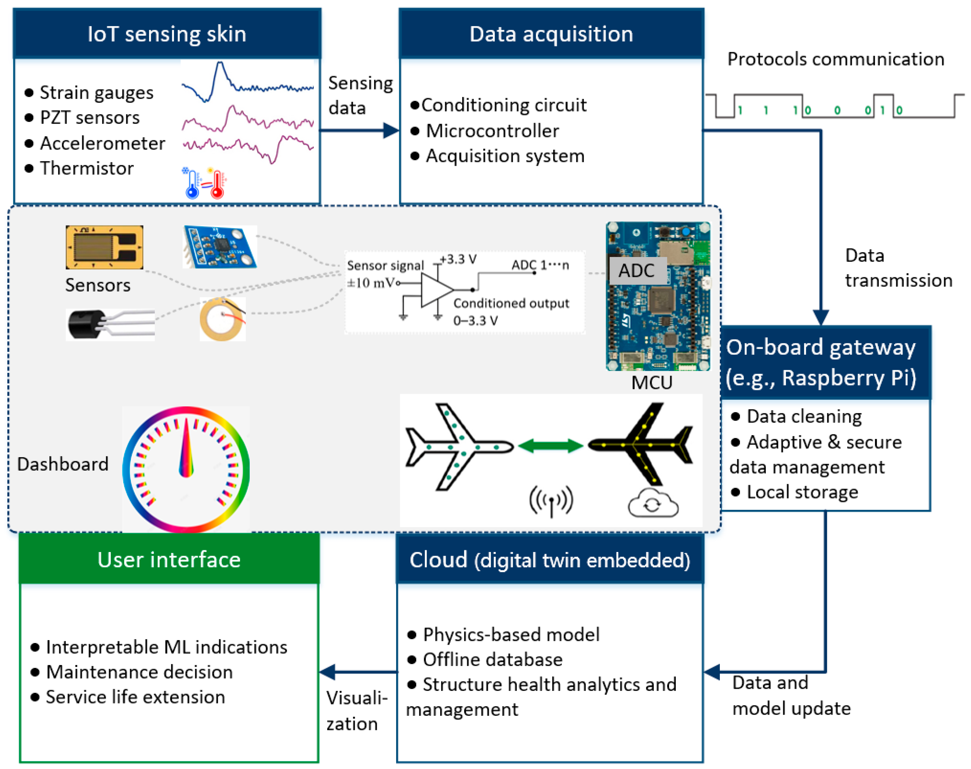 - Fu, H.; Sharif-Khodaei, Z.; Aliabadi, M.H.F. An energy-efficient cyber-physical system for wireless on-board aircraft structural health monitoring. Mech. Syst. Signal Process. 2019, 128, 352–368. [Google Scholar] [CrossRef]